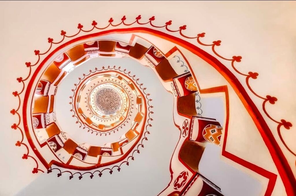 Nhìn từ trên cao, cầu thang xoắn trong Bory Castle mở ra như một chuyển động liên tục, nơi kiến trúc, hội họa và cảm xúc hòa vào nhau bằng
