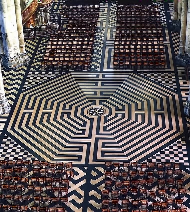 Ánh sáng dịu đi qua những ô cửa kính màu, mê cung tại Nhà thờ Đức bà Amiens hiện ra như một tấm thảm đá đang thở. Những đường kẻ