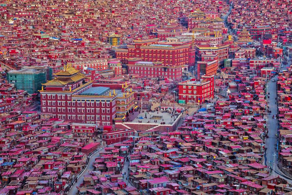 Trên những triền đồi gồ ghề của cao nguyên Tây Tạng, Larung Gar trải rộng như một thành phố được chạm khắc từ sắc đỏ của gỗ và niềm tin.
