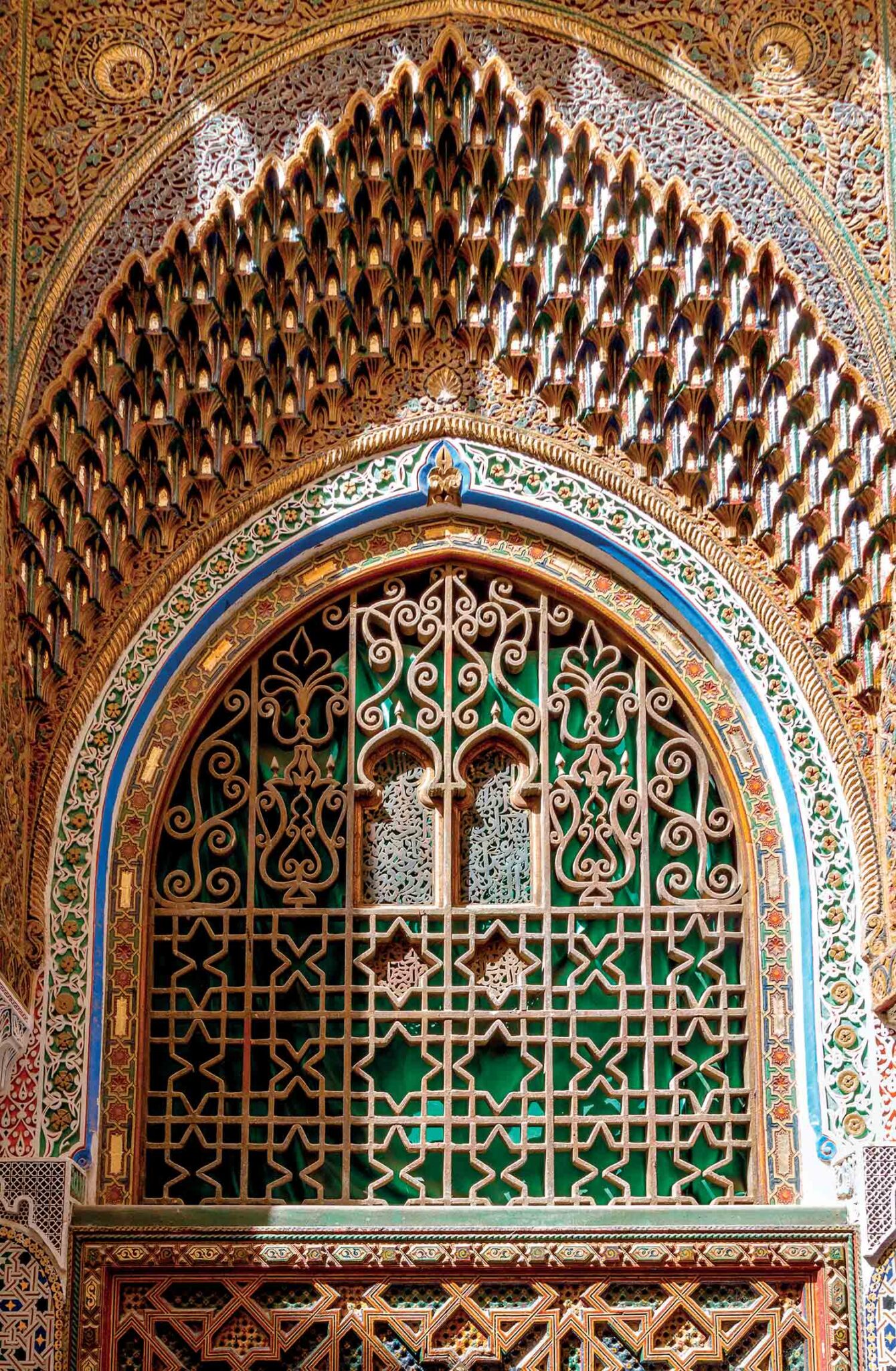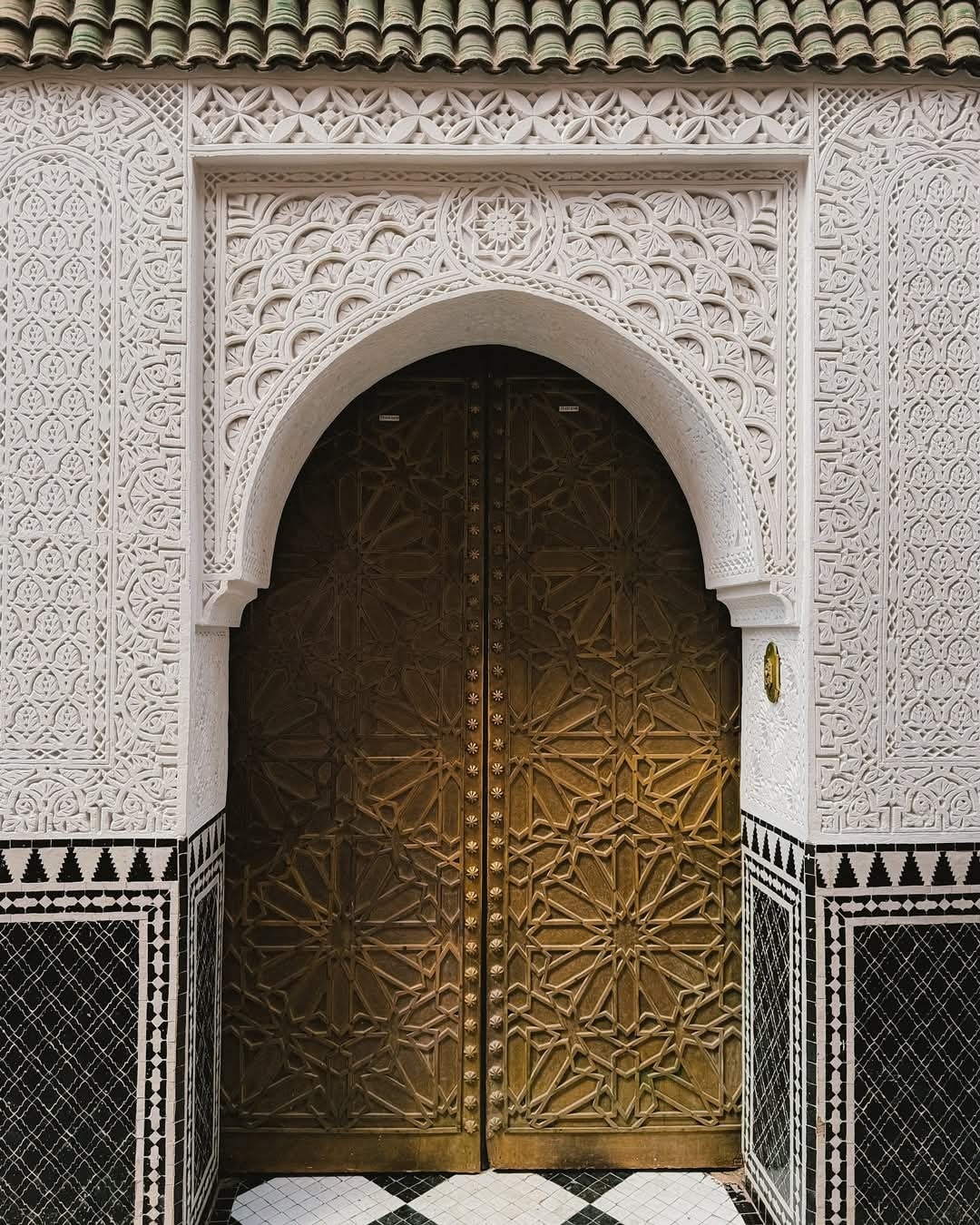 Phần thạch cao trắng quanh cửa là tác phẩm của kỹ thuật taqsir – chạm khắc trực tiếp lên thạch cao ướt. Nghệ nhân cần làm việc nhanh, dứt khoát trước khi thạch cao khô lại. Những mô-típ vòm lưới (muqarnas), hoa dây arabesque và layer hình học lặp từng tầng cho thấy tay nghề cao của các maalem, những bậc thầy được truyền nghề qua nhiều thế hệ. Mỗi đường nét đều được vẽ bằng compa, thước gỗ và mẫu truyền thống trước khi đưa vào bề mặt. Khi ánh sáng rọi đến, từng đường cắt nhỏ trong thạch cao tạo nên vùng sáng tối đan xen như di chuyển.