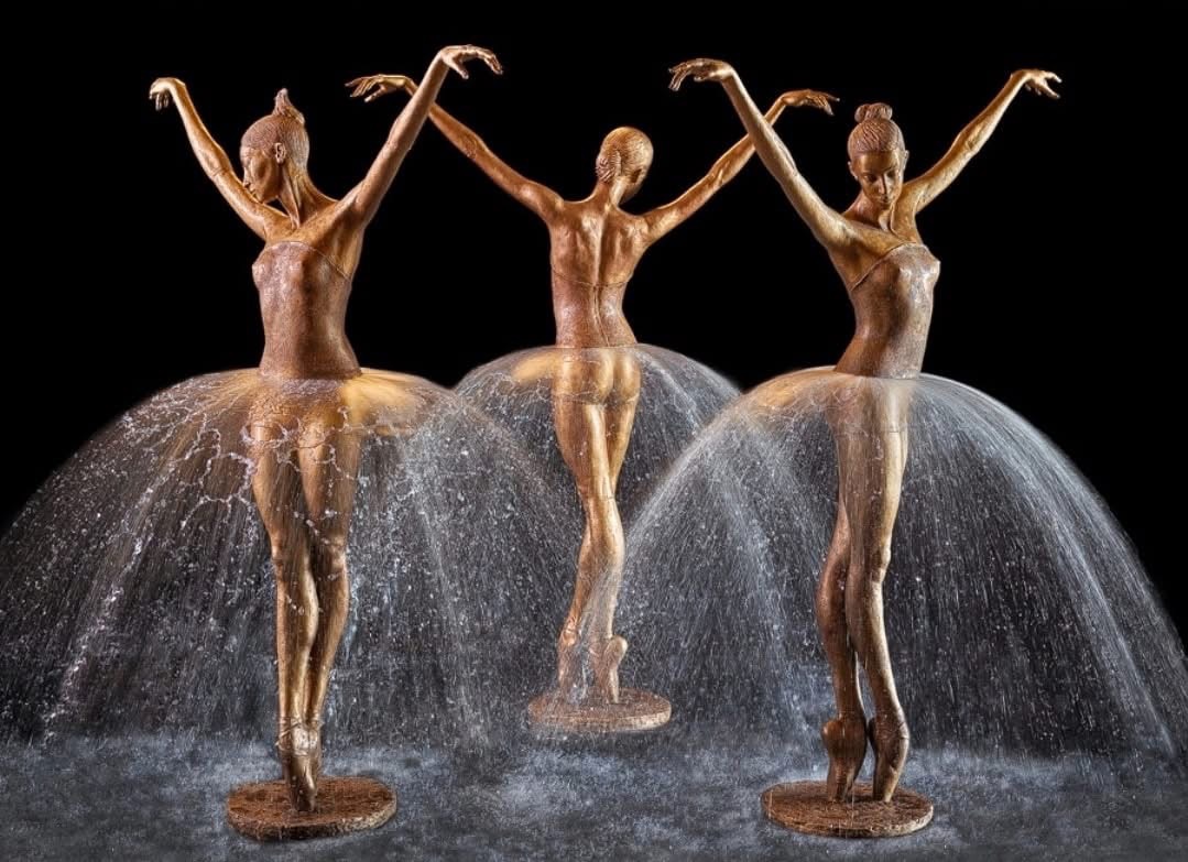Cơ chế hoạt động của những đài phun nước này dựa trên hệ thống dẫn nước được thiết kế ẩn bên trong lõi tượng. Khi nước được đẩy lên từ dưới chân tác phẩm, các khe nhỏ được bố trí chính xác tại tóc, eo, cánh tay hay thân váy sẽ phóng dòng nước ra theo đúng hình dáng của chuyển động cơ thể. Nước ôm lấy tượng, biến trạng thái rắn và lỏng thành một vũ điệu hai tầng – kim loại đứng yên còn dòng nước chuyển động liên tục. Điều này yêu cầu kỹ thuật cực kỳ chính xác: nếu lực nước quá mạnh hoặc điểm mở không chuẩn, “chiếc váy” nước sẽ vỡ hình; nếu nước quá yếu, chuyển động sẽ mất đi vẻ mềm mại mà nghệ sĩ mong muốn.