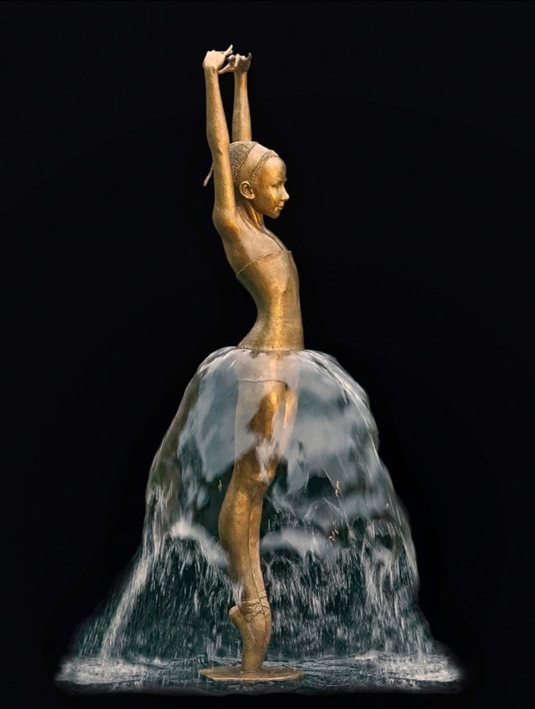 Dưới ánh nước trong veo đang đổ xuống như một lớp váy mềm, tác phẩm của Malgorzata Chodakowska mở ra cảm giác vừa tĩnh vừa động, như thể khoảnh khắc vũ công nâng cánh tay lên cao đã được giữ lại trong thời gian. Sinh năm 1965 tại Ba Lan, Chodakowska trưởng thành giữa những năm chuyển mình của nghệ thuật Đông Âu, trước khi sang Đức học điêu khắc và bắt đầu hành trình sáng tạo khiến tên tuổi bà được nhắc tới như một trong những nghệ sĩ tạc tượng – kết hợp đài phun nước – độc đáo nhất châu Âu.