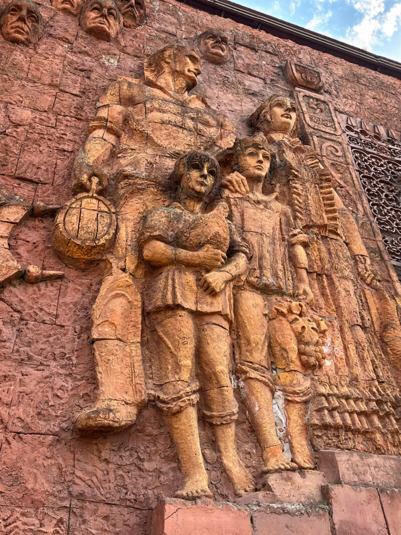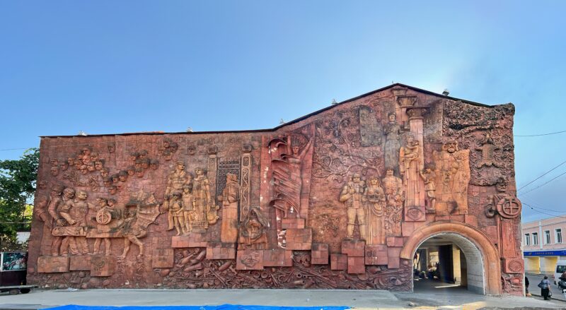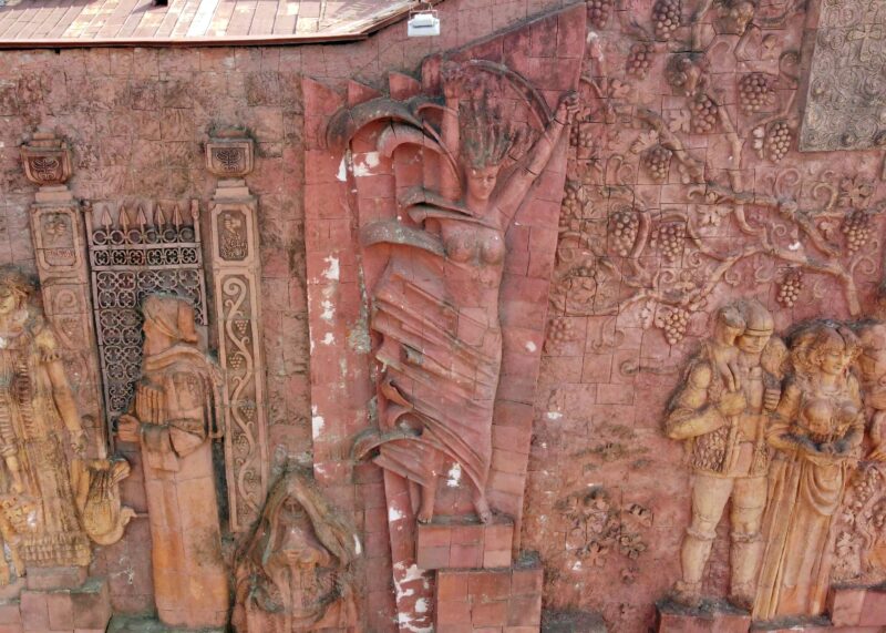 Lớp đất nung ánh đỏ trải rộng trên mặt tiền Chợ Xanh ở Kutaisi, phù điêu của Bernard Nebieridze hiện ra như một trang sử được tạc bằng lửa và ký ức. Những gương mặt, những chùm nho, những nhạc cụ và các mảnh đời được chạm nổi lên bề mặt khiến bức tường trông như đang kể chuyện bằng chính nhịp thở của thành phố cổ. Ánh sáng lướt qua các đường nét khắc sâu – chỗ thì mềm, chỗ thì gồ ghề – làm hiện rõ cả một miền văn hóa Caucasus mà nghệ sĩ đã dồn vào đất, để nơi này trở thành một cánh cửa bước vào lịch sử sống động của Kutaisi.